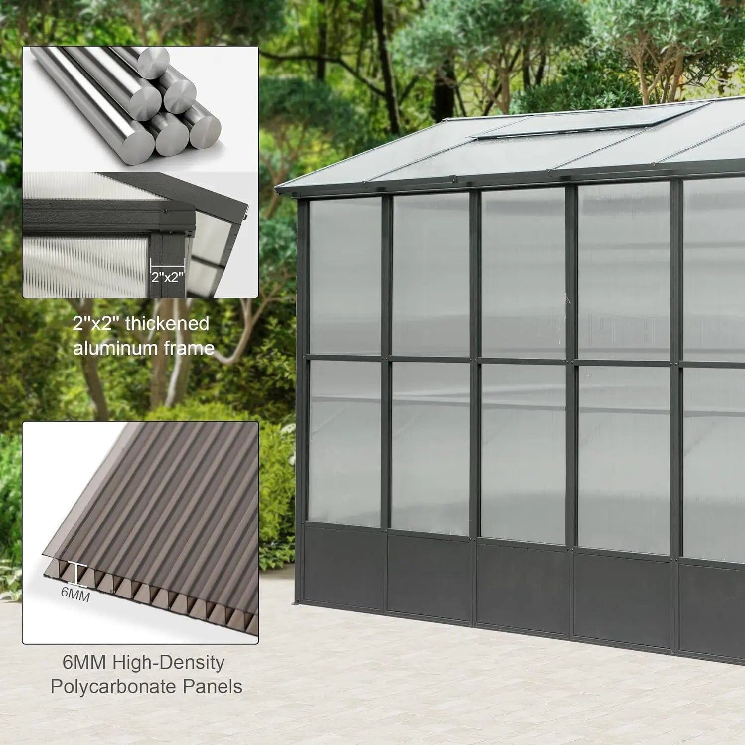 - Polycarbonate panels diffuse light, block UV rays, and protect plants, while the 8x10 ft footprint provides generous growing space.