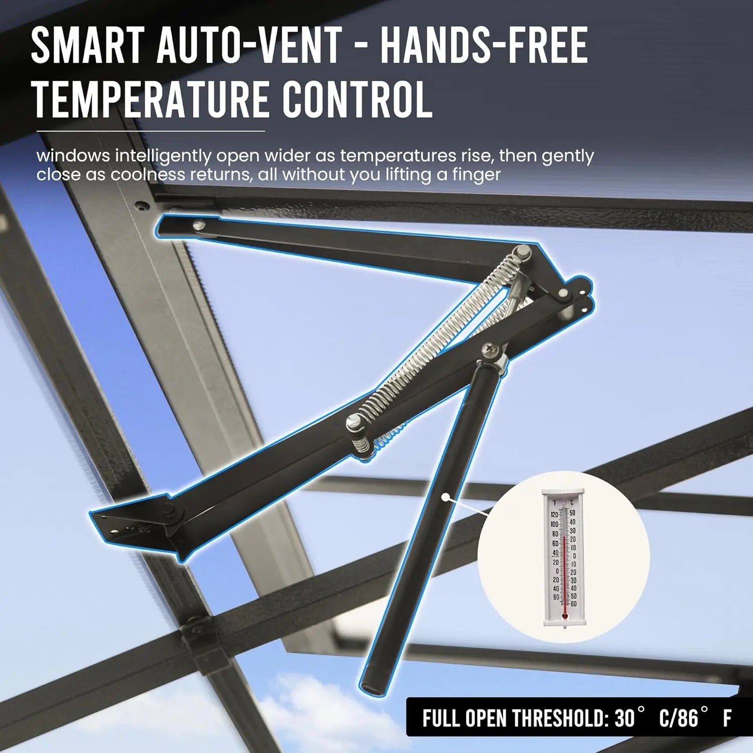 - Extra-tall, walk-in design with an 8 ft interior height gives you ample space for vertical gardening, shelving, and easy movement around plants.