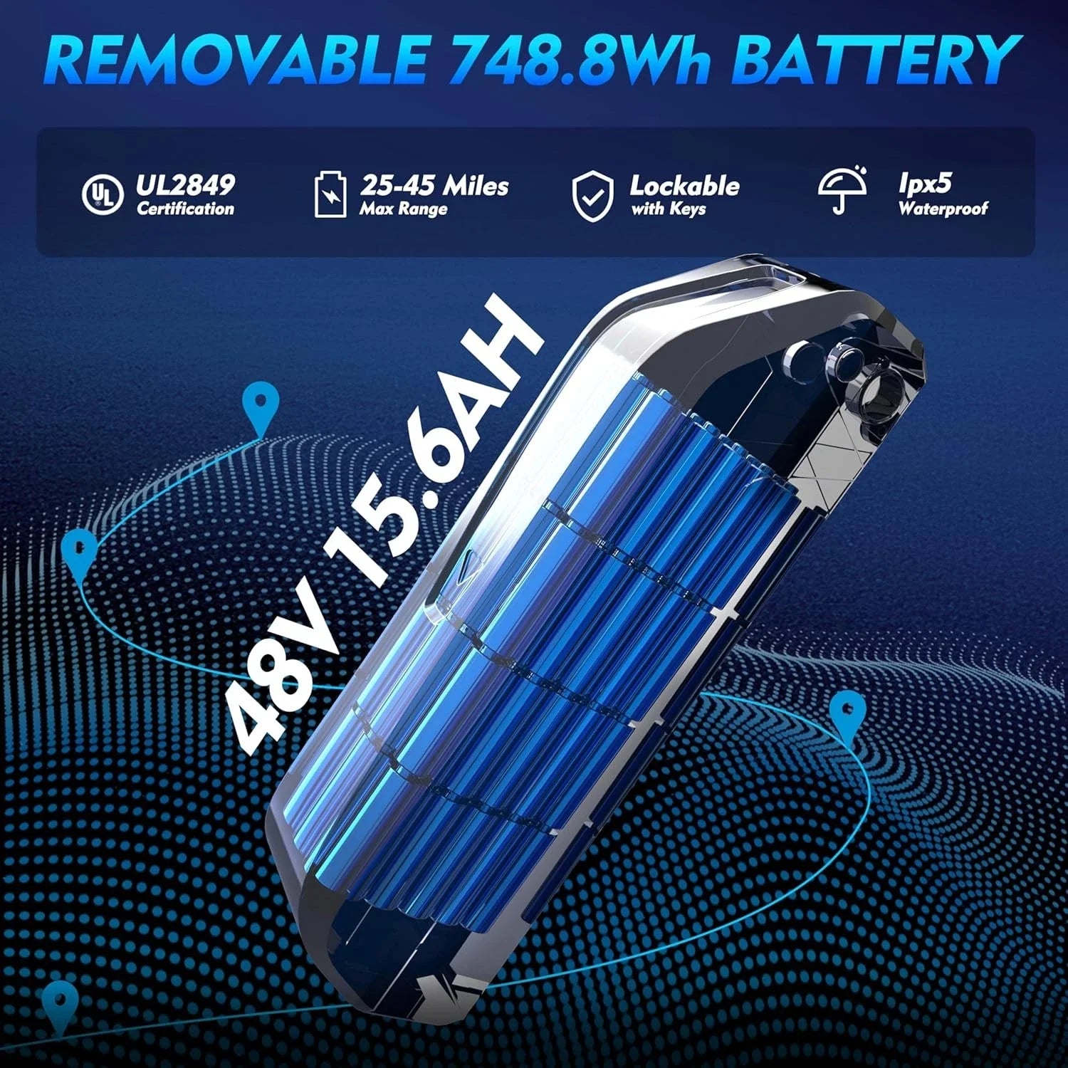 - You get a 1000W peak motor delivering up to 30 mph, powered by a 48V 15.6Ah battery for long, confident bursts.